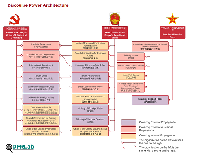 报告还详细分析中国打造话语权体系的架构,党、政、军三大系统都有自己的主责单位,至少24个机构涉入其中,对内与对外宣传的角色不同。