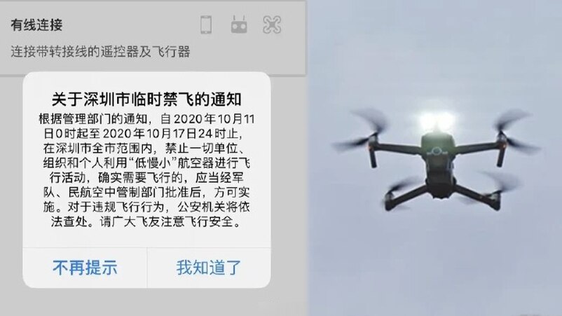 习近平访粤前,广东多地公安都已经下「禁飞令」,禁止在城市使用无人机,深圳管理部门发出通知,指从今日(11日)至周六(17日)深夜,全市所有个人及单位都不准使用如无人机等「低慢小」航空器。