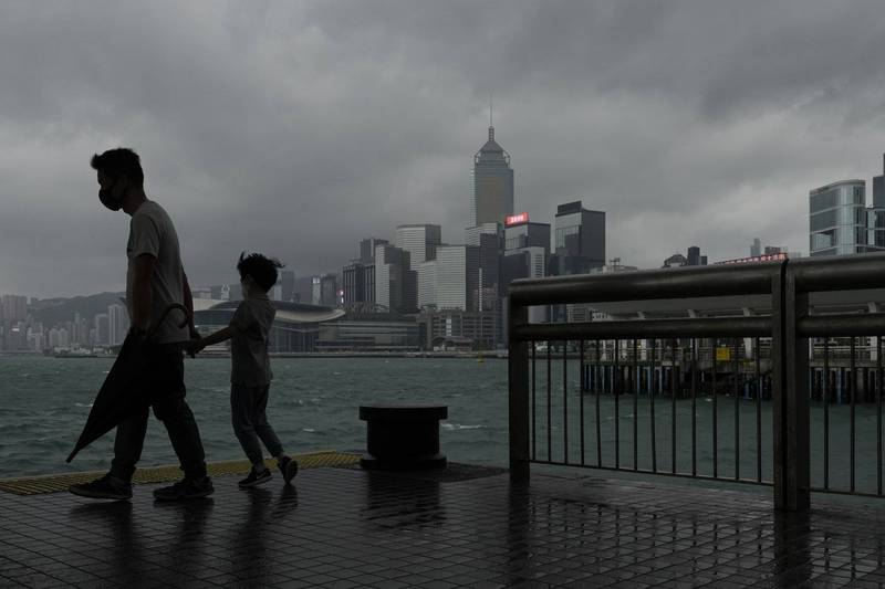香港無風小雨掛8號風球,暫停股市交易。圖為香港民眾帶著兒子走在維多利亞港岸邊。(美聯)
