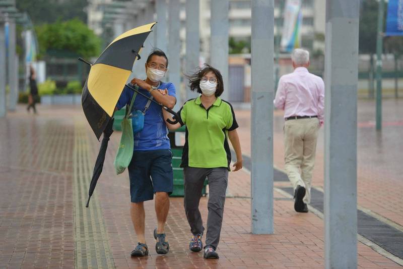 香港無風小雨掛8號風球,暫停股市交易。圖為香港民眾在路上行走。(法新社)