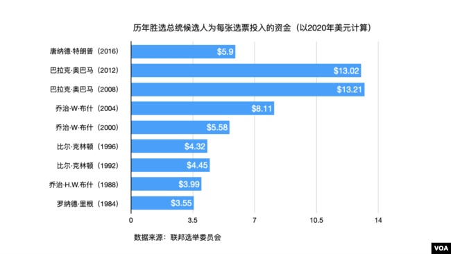 那么历年赢得美国总统大选的候选人,他们最终在每张选票上都花费了多少?简单的计算方式是将他们的竞选经费开支,除以他们赢得的大选普选票数。以2020年美元计算,多数情况下,一张选票在四到六美元之间,相当于一杯星巴克咖啡。最昂贵的是2008年和2012年大选时奥巴马赢得的选票,平均每张约13美元,特朗普2016年赢得的选票每张价值约5.9美元。