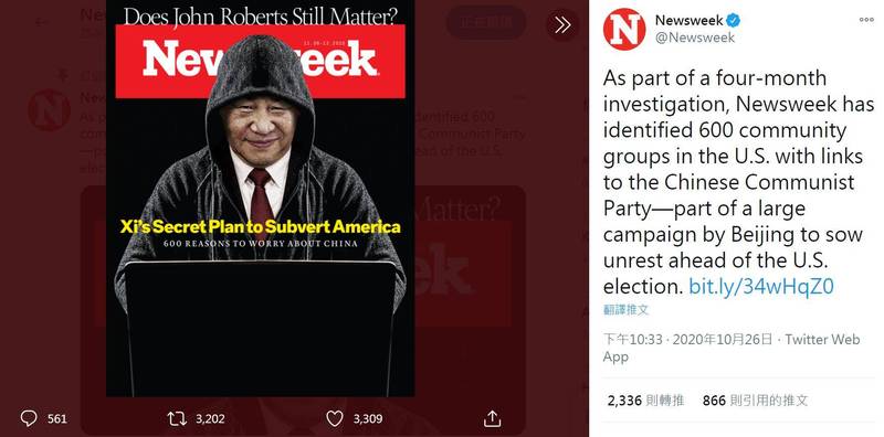 美國《新聞週刊》最新一期標題名為「習近平密謀推翻美國─600個擔心中國的理由」,作者是德國外交政策協會(German Council on Foreign Relations)資深研究員狄雨霏(Didi Kirsten Tatlow),經過《新聞週刊》4個月的調查,中國目標是在美國總統大選前引起混亂,企圖影響選情。