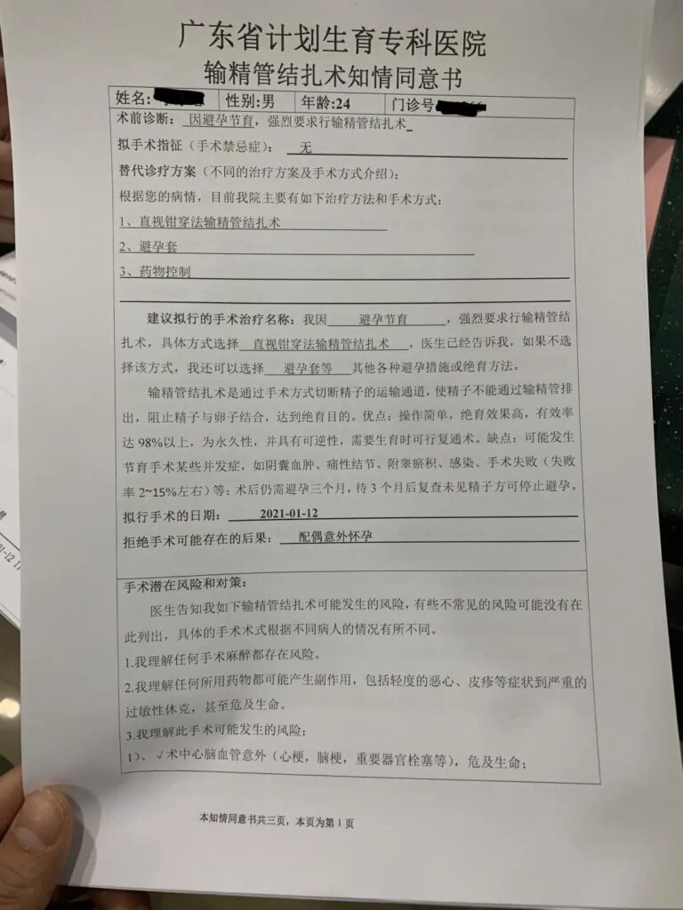 整个过程下来,我很深刻的感觉到,在父权社会里面,男性的生育自主同样是受侵犯的,医生不会把年轻的单身男性看作独立的个体,只看作是家庭的附庸。一个单身男性申请绝育手术要经过监护人的许可,或者需要提供结婚证和妻子的许可,而单身女性申请绝育手术则没有这些限制,这实在让我难以接受。正是这样的计划生育制度让女性在生育上付出更多,而男人(无论是主动还是被动)承担得更少,即使男性绝育的风险比女性绝育要低很多。