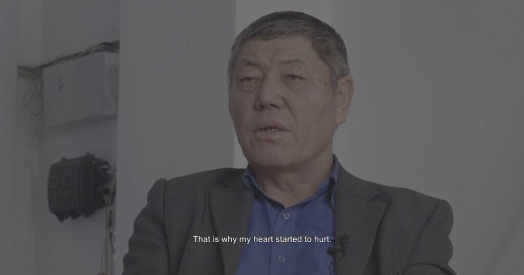 你不知道他们是因为什么罪名把你带到那里,你就只能在那里待着。所以我只好待着。他们曾经对我们说我们永远都出不去,说我们会被判刑,入狱5到30年。他们说他们会把我们关到我们改变看法为止,如果我们不改变看法,他们就会一直把我们关下去。他们说他们能关我们50年,直到整个民族,哈萨克族、维吾尔族和其它穆斯林民族全都消失。他们说,有一份从上面下来的文件,从中央来的,他们正在遵照这份文件做事。他们说,没有人能改变这份文件,因为它是党中央来的。他们说,除非所有穆斯林民族都灭绝,否则现行制度不会改变。“只有当你和你的子孙后代都变成中国人的时候,现行制度才会改变,”他们说。他们跟我说别想着回哈萨克斯坦见家人了。他们说这是不可能的。当你听到这种话的时候,你会觉得恶心、睡不着觉。这种话是对我来说最难忍受的,即使没有人打我。这是我开始心口痛的原因。