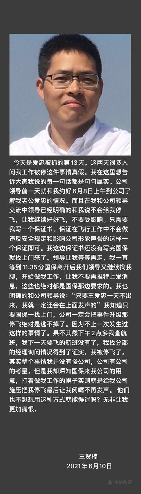 据王贺楠6月10日推特:本来我可以继续上班就是因为国保找到了公司。他们打着做我工作的幌子实则就是给我公司施压把我停飞最后让我闭嘴不再发声。 他们也不想想用这种方式就能得逞吗?无非让我更加痛恨。
