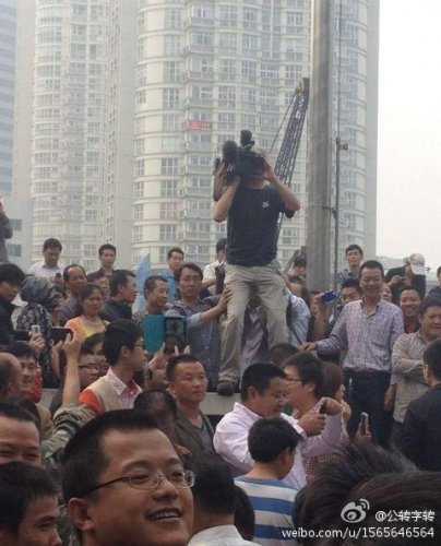 浙江镇海全民反PX(对二甲苯)抗议示威活动,合力托起一名外籍摄影师,协助其拍摄