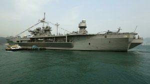 USS Blue Ridge (LCC-19), the lead ship of the two Blue Ridge-class command ships of the U.S. Navy, is seen in Hong Kong waters
